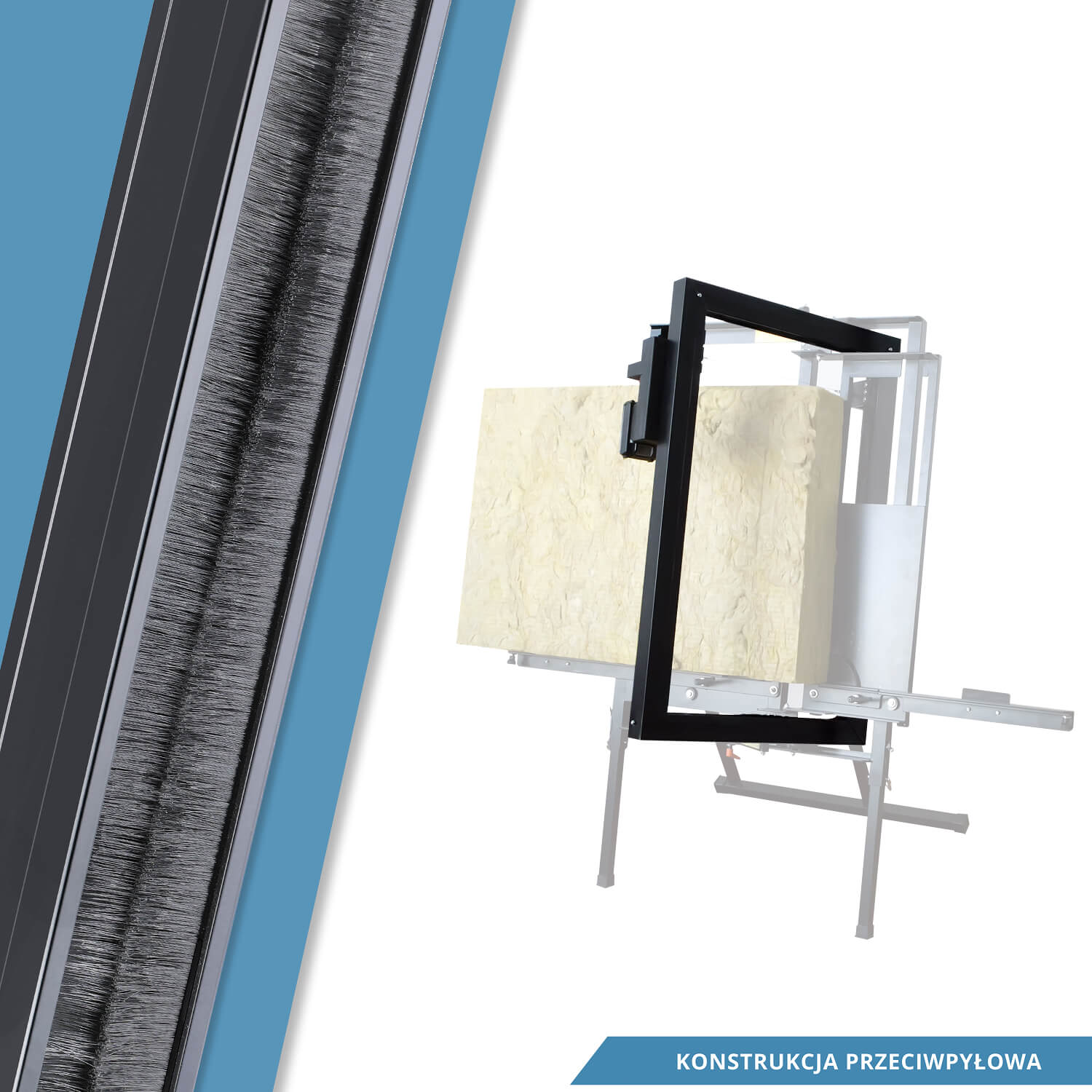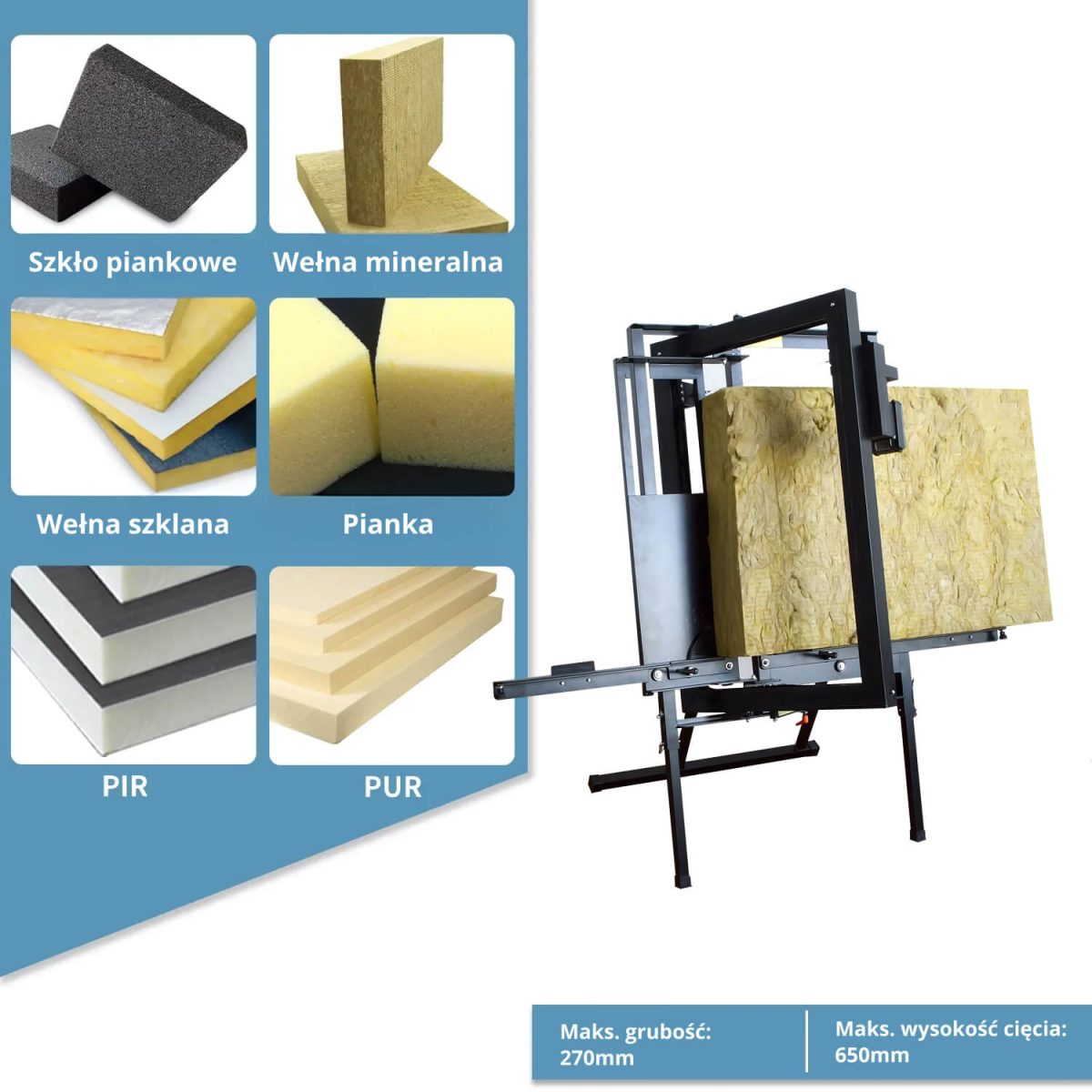 🧱 Wielozadaniowość materiałowa: Tnie wełnę mineralną/szklaną, płyty PIR/PUR, szkło spienione i styropian.